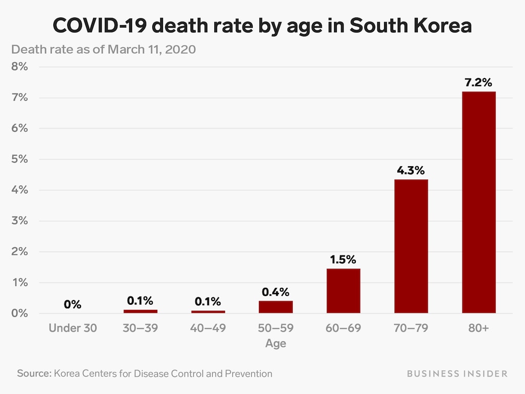 Figure 3: Death rates in South Korea from COVID-19 were low in individuals below the age of 70.