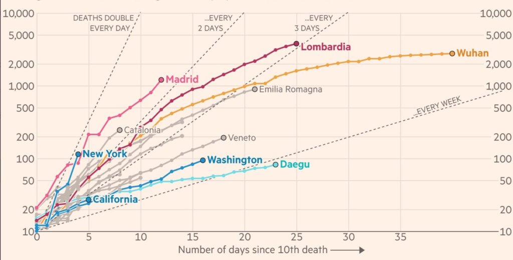 Is there data to support this possibility? People have touted the lower rates of death in Korea are due to their expansive screening program. However, if one looks at Figure 1, Korea has a much younger infected population when compared to Italy. Given the difficulty that older people have in managing this infection, their immune system senescence and other health problems, it is not surprising that Italy would have significant more deaths from coronavirus infection than Korea regardless of testing. Supporting this, the average age of deaths in Italy is 80 years old. Therefore, it would appear that the overriding variable in the severity of illness in these countries is likely to be the age of the infected population. This is also been identified as a reason that Germany’s death rate appears to be lower than the rest of Europe. Death rates are compared in Figure 2 from the Financial Times, and it is interesting that the lower rate in Korea is attributed solely to early screening. The one place where the age of the populations does not explain the death rate is Japan, as they have the oldest population in the world. But there are unique aspects of Japanese society that make it difficult to extrapolate to other countries.