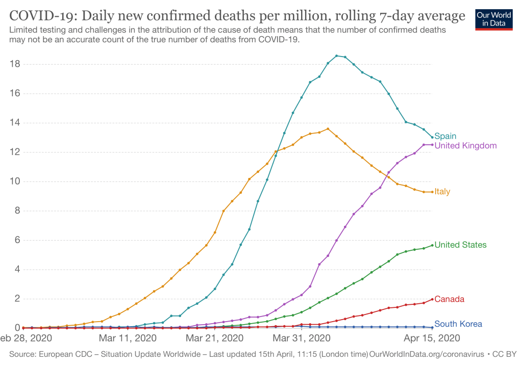 In the above figure, the daily deaths in the United States do appearcontinue to increase. But death rates per million inhabitants tells another story. US death rates are stabilizing and are actually flattening at lower levels than most European countries. In fact, the United States will never reach the death rates per capita that were seen in Europe. Social distancing is one reason for that.