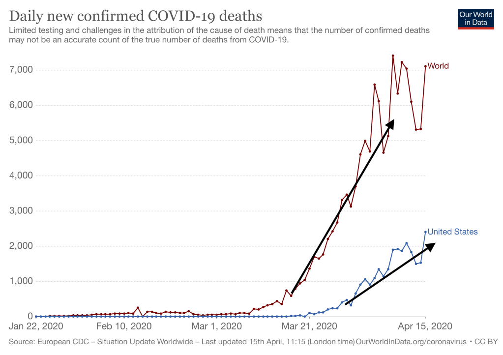 The number of people who are testing positive for the virus in US areas most affected by COVID-19 is starting to decrease and the number of individuals seeking medical care has also dropped. Concerns have been raised, however, that the death rate does not seem to be dropping. The graph of daily deaths shown below indicates that total deaths continue to rise. Remarkably, as compared to what you hear in the news, the increase in new deaths (slope of the curve as defined by the arrow) is less in the US than the world as a whole.