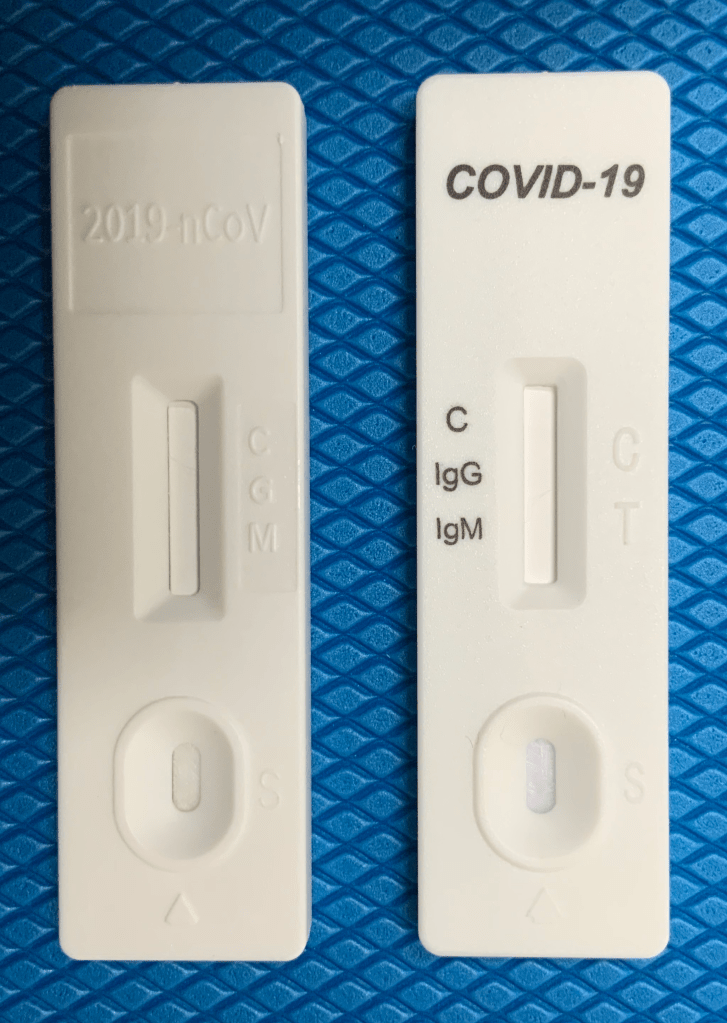 Finally, the test itself may be problematic. It may have been poorly manufactured, so the markings do not line up with the red (reagent) lines. Another issue can be seen in this picture were the markings on one device are simply embossed on the white plastic shell. This particular test would be difficult for an operator to read the bands correspond to IgG and IgM. On this particular essay, people also confuse the C (control) line with the G (IgG) line. Some tests have faulty reagents including the gold nanoparticles the COVID-19 proteins coupled to them. This again will give false negative results. The test can also have been stored improperly and not function.