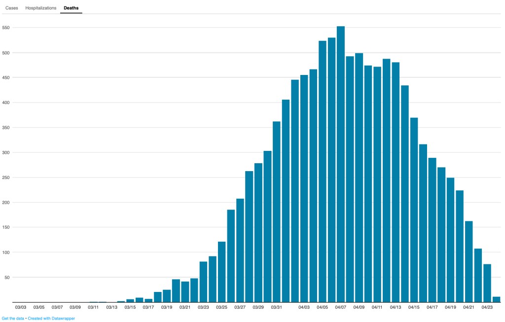 The Hospitalizations (upper panel) peaked before the Deaths (lower panel), which is not surprising because most individuals are sick for some time before they die. However, both the hospitalizations and deaths have dropped precipitously! The graphs end three days ago (reporting lag), but the drop is expected to continue.