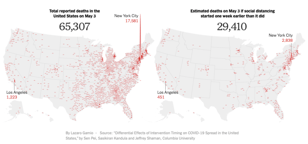 First, contrary to the title’s assertion, there is no data. This story is based on estimates from a mathematical model that “predicts” death based on trends observed at different time points. This model was done under the direction of Jeffrey Shaman, Ph.D., an epidemiologist at Columbia University. Therefore, there are no actual deaths to support the contention that  36,000 lives would be saved.