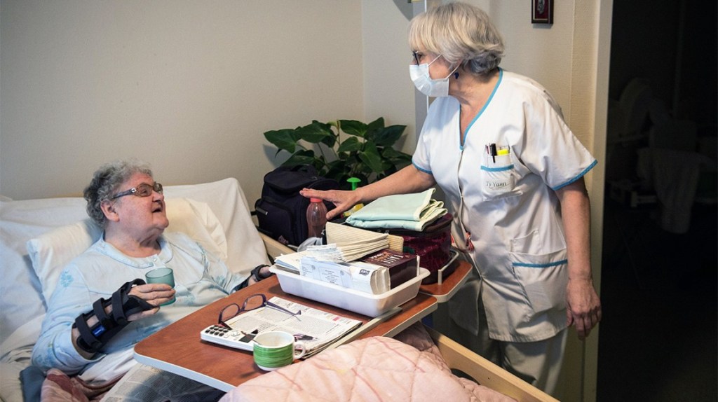 It is important to ensure that an individual in the nursing home is appropriately protected from COVID as best as possible. Review the COVID management plan for the facility. All of the workers in the facility should be wearing masks and gloves, and it would be important to know whether the facility was specifically housing COVID patients, even if they are in a different wing.