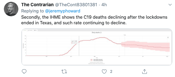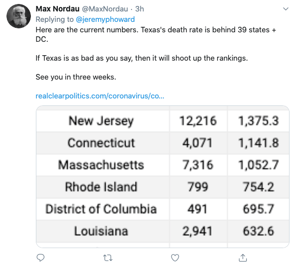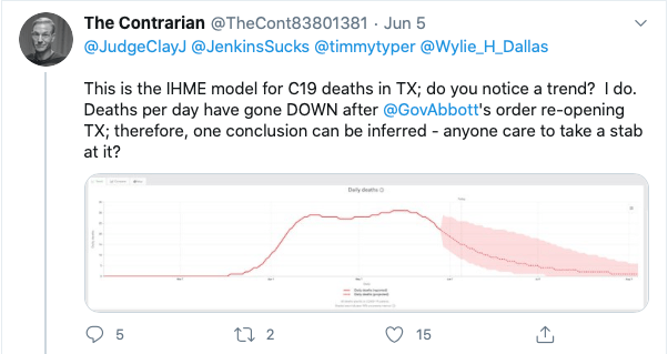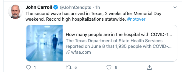 Today Twitter was alive with talk of the “spike” of COVID-19 in Texas, a result of released and lax social distancing.