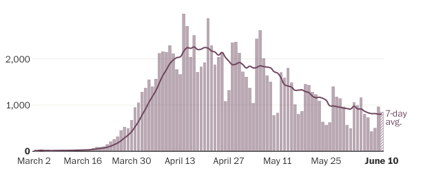 Hi, Jim – Do you have any insights into those states who seem to be reporting the precise same number of new cases per day, day after day? It strains credibility for me that the lines on the reporting graphs are utterly flat. Any clue what is happening in those cases? Also, my dad lives in Arizona where cases have been spiking upwards. He reports that the ICUs in his area are indeed being overwhelmed and his elective surgery was canceled last Friday because of COVID pressure on the health system. That, to me at least, implies that while the overall US may be seeing a decline, there are states that are still very much on the upswing in cases. Would love to hear your insights on this since it seems like the thing we are trying to manage by flattening the curve is avoiding overwhelming hospital capacity. If hospital capacity is getting overwhelmed, then it seems that regardless of cause (more testing or different reporting or whatever), it is a substantial problem for those states. Thanks for your blog! Jen