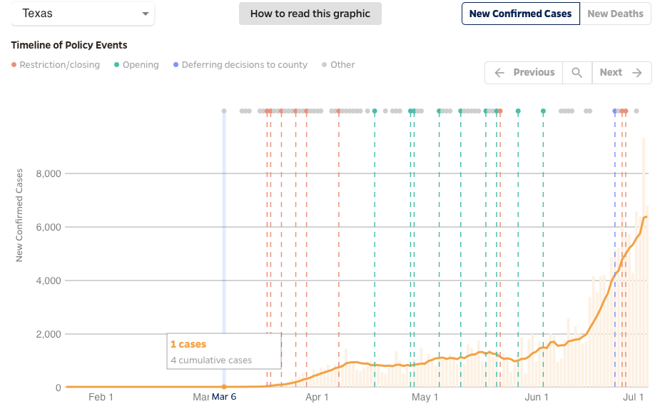 Yesterday, ABC news ran a story comparing Florida, Connecticut, Texas, and Ohio in their handling of COVID. While the story was balanced in how it described the state’s handling of the infection, it implied that the social distancing requirements directly led to current virus numbers. While this clearly played a part in where each state finds itself, I think there are also other dynamics at play. This is important to understand, as it helps to guide future plans for states. I looked at five states, four with increased infections.
