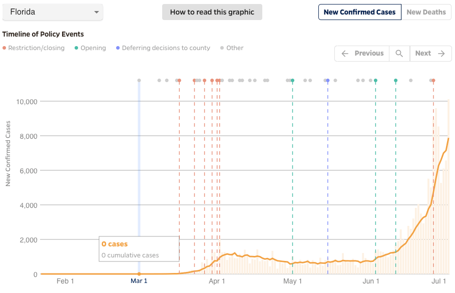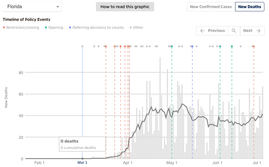The number of new cases is actually lower than in Florida or Texas, but deaths are now equal or higher than those states and increasing. This suggests either a change in the dynamic of infection in AZ, or a difference in counting deaths. But it raises more concern about hospital and support resources. So the biggest worry right now is not Florida but Arizona.
