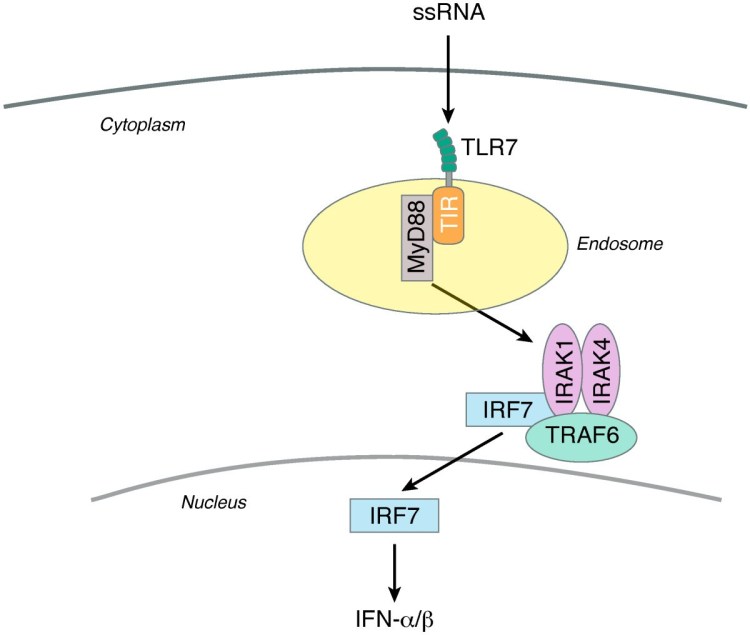 The immune system initially recognizes the presence of a foreign invader by recognizing components of the virus that are different from components of the human body. In the case of COVID-19, one of the first things that is recognized is single stranded RNA, the genetic material of this virus. Humans do not have a similar type of RNA and receptors in their cells that take up virus will activate what’s called the innate immune system to start a response against the virus. There is a specific cellular receptor for single stranded RNA called “toll like receptor seven (TLR7)”, and viral RNA binding to this receptor produces potent, antiviral hormones (cytokines) called interferons.