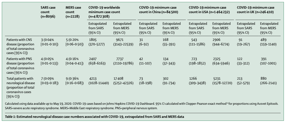 Over the past few days I’ve been concerned about several news stories focused on an exceptional number of severe neurological complications associated with COVID-19 infection. While these complications are not surprising, since almost every human viral infection is associated with some type of neurological disease, the spectrum of these complications was worse, and the implied frequencies seemed higher than might be expected. In particular, neurological problems with the pandemic coronavirus infection SARS were relatively infrequent (less than 0.1%).