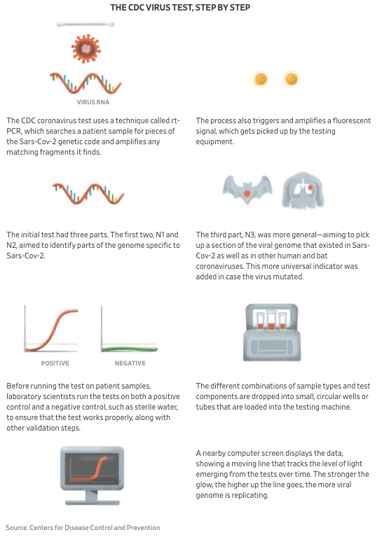 Tonight, I’d like to refer you to a remarkable article in the Wall Street Journal that chronicles the missteps at the Centers for Disease Control that delayed COVID-19 testing for three weeks in February. This delay certainly contributed to a lack of understanding of how widespread the disease was in the United States, but also left institutions and individuals powerless to know who had COVID-19 infection. The report also documents how molecular (PCR+swab) tests detect the SARS-CoV-2 virus in excellent graphics and explains exactly what went wrong with the CDC test.