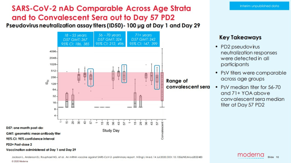The titers of antibody (immune proteins) induced in subjects over the age of 71 were similar to those in younger individuals, aged 18-55 or 55 to 70. As shown above, antibodies that neutralize the virus (and protect from infection) were also indistinguishable in younger and older subjects, and were similar to antibody levels in individuals who have recovered from COVID-19 infection.