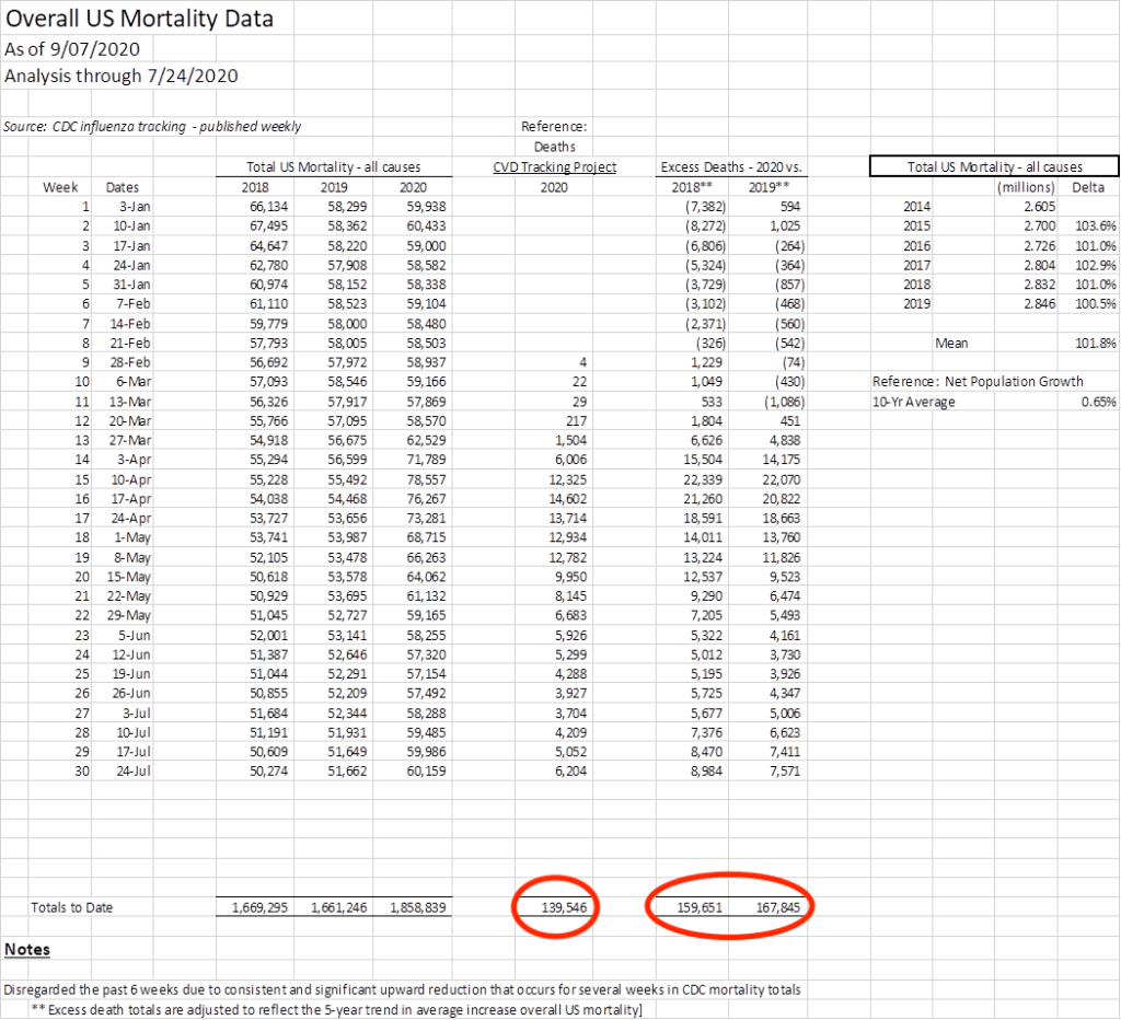 He presented his analysis in a table, shown above. It is based on actual weekly data from the CDC on overall mortality and compares 2020 with the past 2 years. The only adjustment he made was to adjust the 2018/19 totals to reflect the 1.8% average increase in mortality the past 5 years. (Roughly 3 times the average annual population growth which reflects the increasing average age of the US). He then pulled in the reported weekly COVID-19 death totals from the “COVID Tracking Project” as a comparator. He could only analyze until July 24th as newer data was not available.