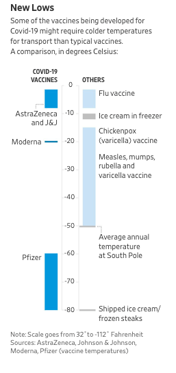 While the ability to distribute these vaccines in an appropriate “cold chain” does not currently exist at the scale needed, several companies are working on improving their distribution systems. McKesson reports they will be able to ship Covid-19 vaccines requiring refrigeration to minus 20 Celsius. They are also working with Cryoport, which provides temperature-controlled shipments for livestock-animal vaccines at minus 196 degrees.