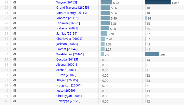 When you examine the AEI data by state and examine the county by county risk factors, however, they are remarkably variable. Looking simply at my own state of Michigan, the risk factors for infection in different counties appear to be variable because they are based on great differences in the number of people tested and infected. Most other states have similar variability.