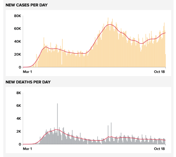 The overall CDC data, which I have been posting for the last couple of days, reflect an increase in infections without consistency across all states and counties. Again, this may be due to differences in reporting.