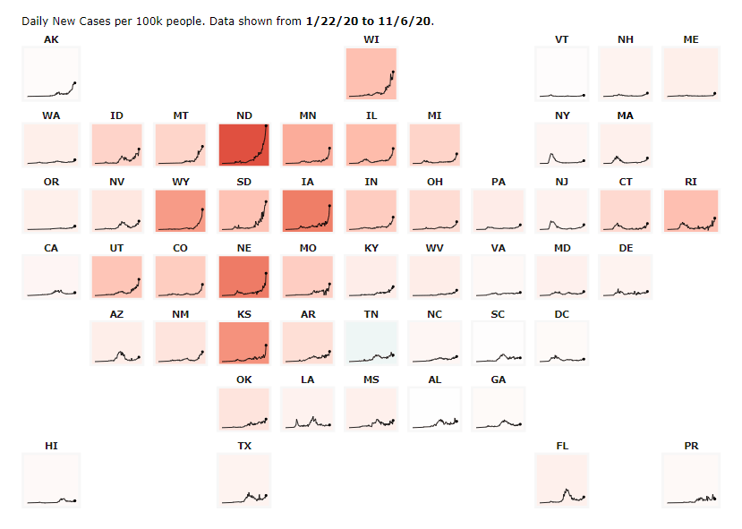 In contrast, trend data from Johns Hopkins show that several stares are responsible for the majority of the increase in the country, with the center of the country leading the way. It is not clear why this divergence is present, but in some ways it depends on how you cut the data.