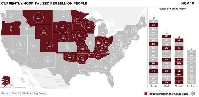 Despite this, some Midwest states are posting alarming per-capita numbers. In both North and South Dakota, one in 2,000 residents is hospitalized with COVID-19. Only Michigan and Illinois don’t have daily records, mainly because so many people in those two states were hospitalized in the first peak.