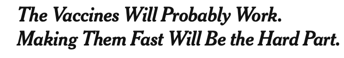 One negative note — several media outlets seem to be continually minimizing the significance of the vaccines. The NYT in particular has paid little attention to the remarkable clinical trial data , instead having a series of articles that have focused entirely on potential manufacturing shortages and problems with distribution. While there may be issues here, it should not be the primary (only!) focus. In one these articles they also went on a rant about President Trump’s suggestion that the vaccines were only “weeks away.” This suggests their concerns aren’t entirely about the vaccine technology.