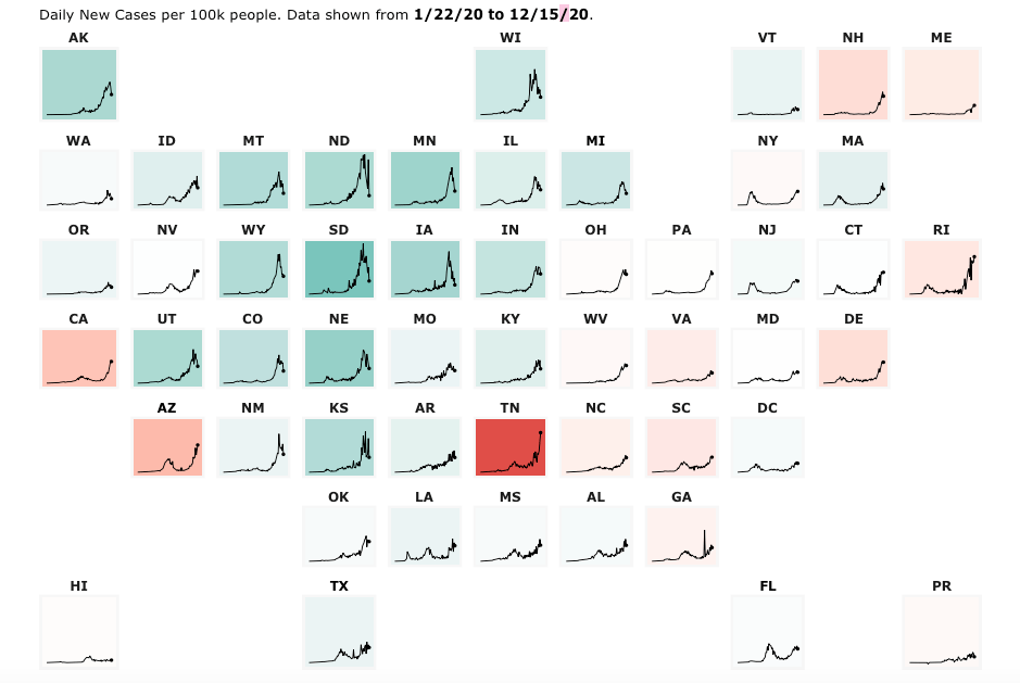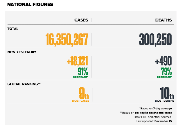 New COVID-19 infections and deaths fell significantly in the United States over the past week. The reasons for this are not entirely clear but may be that we’re getting far enough out from Thanksgiving that those additional infections have resolved. The overall number of infections remains high, and there are still hot spots in places like Tennessee and California, but Michigan, Ohio, and Indiana in particular have seen infections drop.
