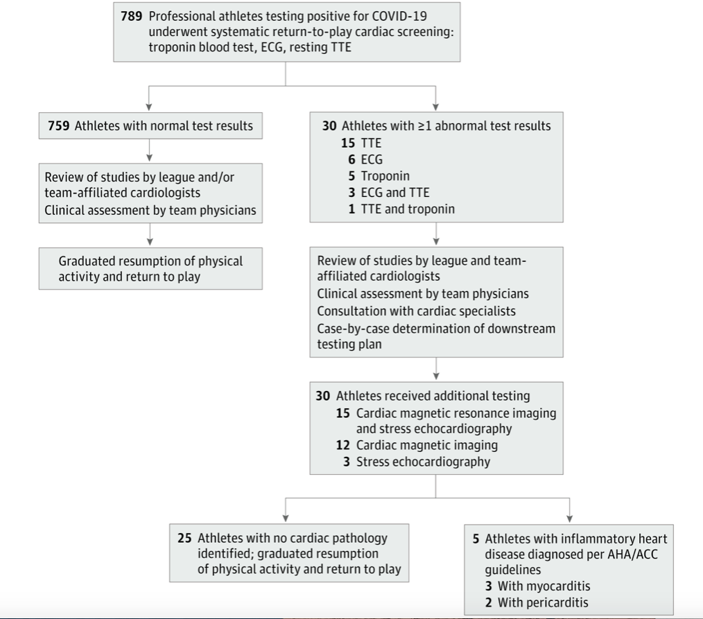 This cross-sectional study reviewed cardiac testing performed between May and October 2020 on professional athletes who had tested positive for COVID-19. Because of the prior JAMA report, the professional sports leagues (Major League Soccer, Major League Baseball, National Hockey League, National Football League, and the men’s and women’s National Basketball Association) had implemented mandatory cardiac screening requirements for all players who had tested positive for COVID-19 prior to resumption of team-organized sports activities.