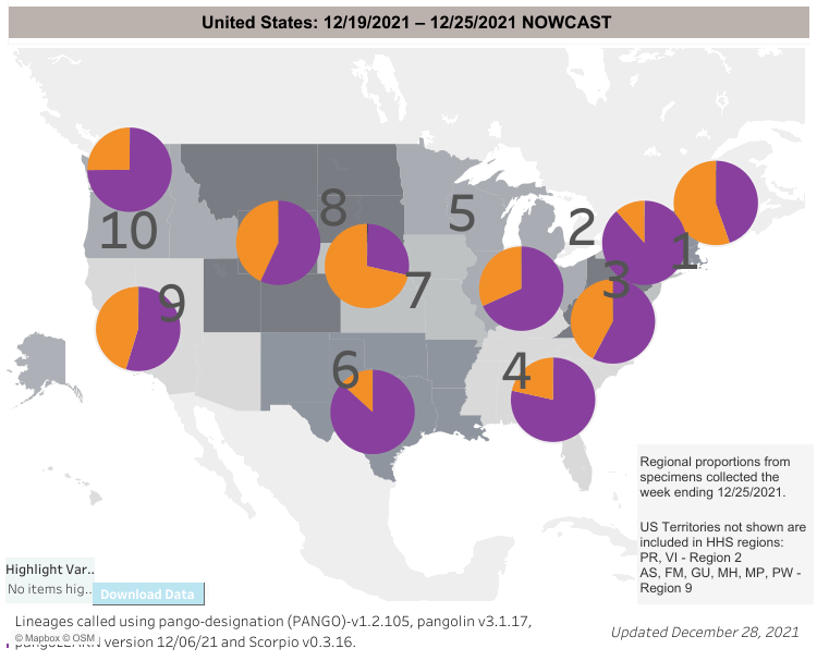 CDC estimates of Omicron (purple) vs. Delta (orange) COVID in different areas of the U.S. Note that Delta infection remains close to half of the infections Christmas week.