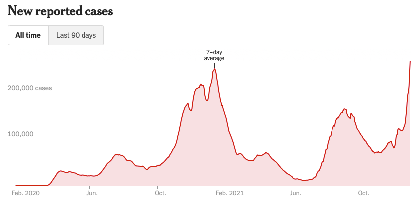 New COVID-19 cases in the USA (New York Times graphic). A tremendous rise is seen in December, equalling the peak seen last winter.
