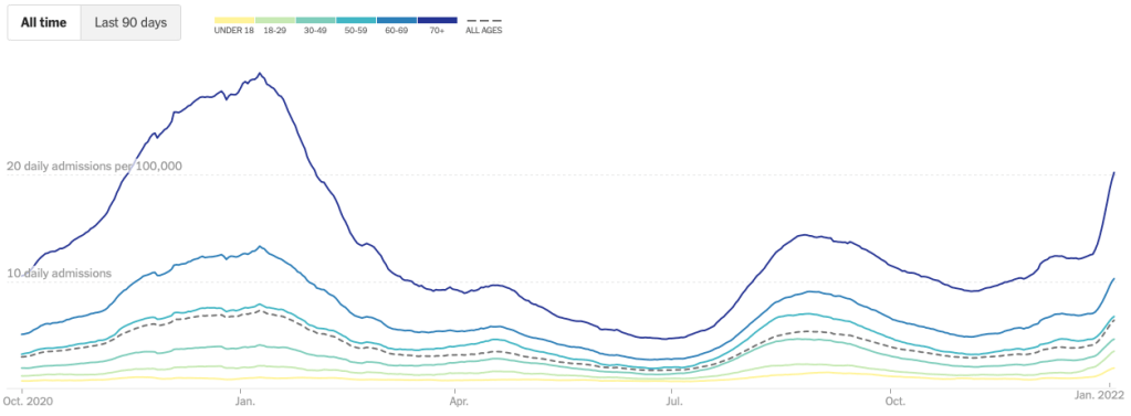 Daily hospital admission rates for COVID-19 broken down by age. Rates of those under 18 are currently 2/100,000 hospitalizations (yellow line) and trail all other age groups.
