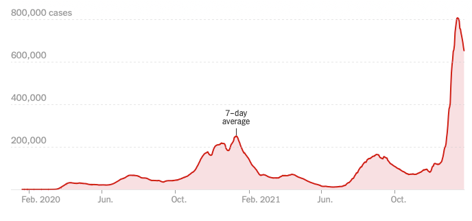Not surprisingly, deaths remain consistent with over 2,000 a day in the U.S. and will take several weeks before they begin to drop, likely in early February. Deaths lag behind other markers of COVID and are highly dependent on early treatment of infected individuals. This is difficult to accomplish in surges when hospitals are crowded.