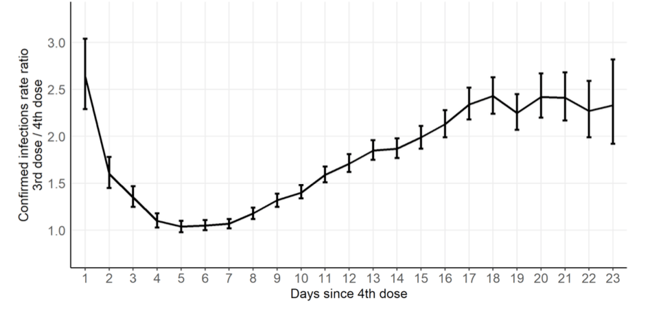 Older individuals were evaluated in a more recent, but as yet unreviewed, study from Israel. It suggests that one week after the 4th dose, “the rate of severe illness in newly vaccinated was lower by a factor of 4.0 (95% CI, 2.2 to 7.5).” That sounds like a lot, but it is important to remember that the prior three shots of the mRNA vaccines have already markedly reduced COVID-19 illness. The difference in the rate of severe illness was 3.5 (95% CI, 2.1 to 5.1) cases per 100,000 person-days even at 12 days after vaccination. Basically, this means taking a 4th dose prevented fewer than 4 significant COVID illnesses per 100,000 elderly people per day. This is a tiny difference that likely will decrease over time as immunity wanes.