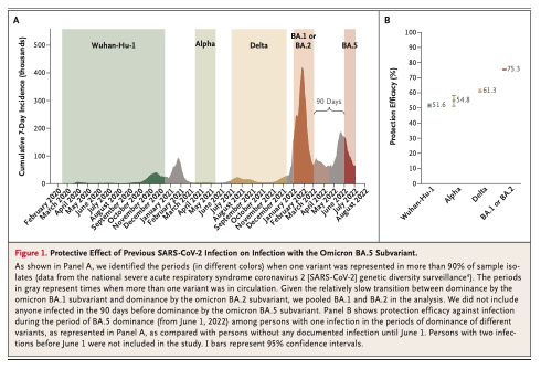 A more important point is that infection itself serves as an effective booster of immunity. As demonstrated below, if you have been infected with any Omicron virus (identified as BA1, BA2, BA4 or BA5) you have strong protection (75% as seen below) against current infection.