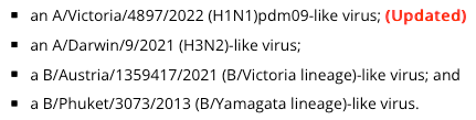 The influenza virus strains in this year’s egg-based vaccine. Only one of the 4 (A/Victoria) has been changed from last year. Source. CDC)
